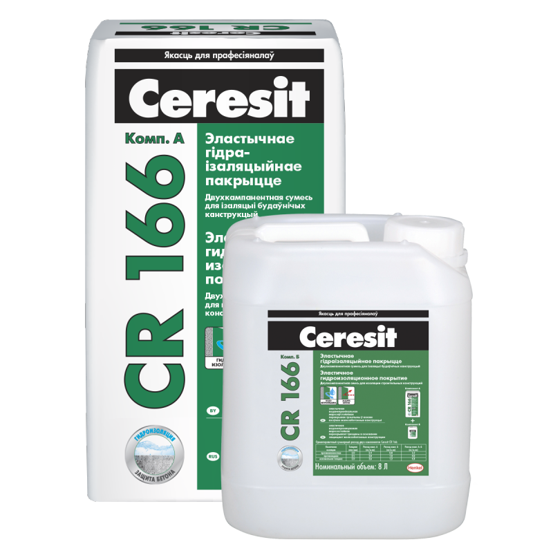 Эластичное гидроизоляционное покрытие. Двухкомпонентная смесь для изоляции строительных конструкций. Ceresit CR 166 применяется для противовлажностной или противоводной изоляции незасоленных минеральных оснований. Может применяться внутри и снаружи зданий, для деформирующихся и недеформирующихся оснований. Подходит для изоляции террас, балконов, мокрых помещений, железобетонных конструкций в грунте, резервуаров очистных сооружений, внутри бассейнов и резервуаров с водой (в т. ч. с питьевой) с глубиной до 50 м. Эластичность Ceresit CR 166 обеспечивает перекрытие трещин в основании шириной до 1 мм. Ceresit CR 166 ограничивает процесс карбонизации бетона и является надежной антикоррозионной защитой для бетона и железобетона от атмосферных воздействий. Непосредственно на покрытии можно выполнять стяжки и штукатурки, не содержащие гипса, а также приклеивать керамические плитки смесями Ceresit CM.
