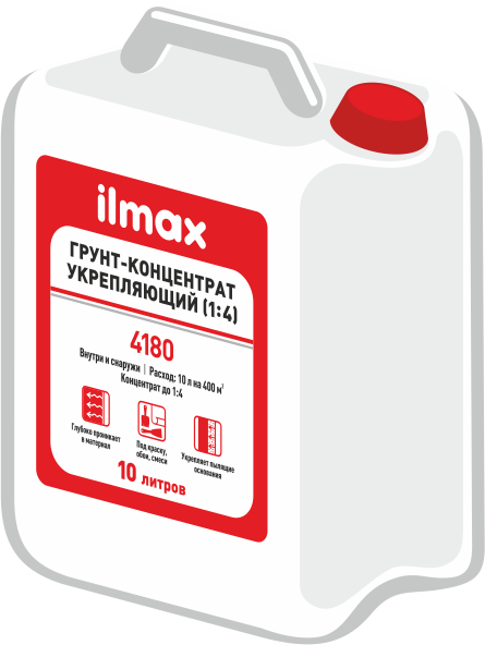 ilmax 4180 предназначен для грунтования минеральных оснований: бетон, цементные, цементно-известковые, гипсовые штукатурки, кирпич и блоки из ячеистого бетона, гипсокартонные и гипсоволокнистые листы, цементные и гипсовые стяжки перед укладкой последующих покрытий: клеевых и ремонтных растворов, штукатурок, шпатлевок, красок, стяжек, самонивелирующихся растворов, а также для защиты от образования высолов.