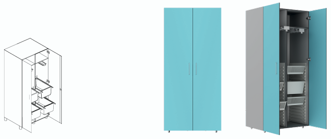 Двери - глухие; направляющие под лотки (корзины); выдвижные рамы с крючком, двухсекционный; изготовлено из HPL панелей; представленны в разной цветовой гамме.