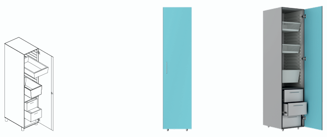 Двери - глухие; направляющие под лотки (корзины); выдвижные ящики; изготовлено из HPL панелей; представленны в разной цветовой гамме.