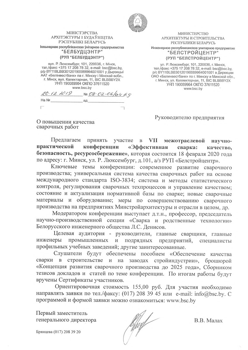С целью ее решения предлагаем направить руководителей и специалистов подведомственных организаций и предприятий для участия в VII межотраслевой научно-практической конференции «Эффективная сварка: качество, безопасность, ресурсосбережение», которая состоится 18 февраля 2020 года.